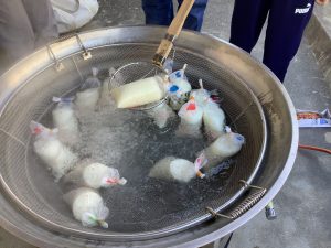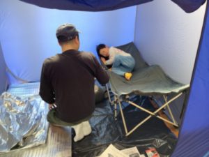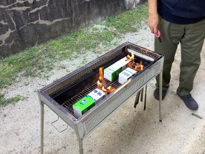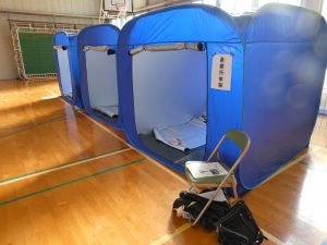 「ハイゼックスを使ったご飯炊き」では、ハイゼックスという袋を使用した茹でる炊飯に挑戦しました。牛乳パックを燃料にして加熱する「ホットドッグづくり」も行い、非常時に役立つ加熱方法を学びました。「非常食の試食コーナー」は、ピラフや炊込みご飯、パン、ようかん、クッキー、お煎餅などの味を確かめました。災害時の食品備蓄を考える機会となりました。「工作コーナー」では、新聞紙を使ったスリッパづくりを行い、飾付けをして自分だけのオリジナル作品を完成させました。みやき町から借用した防災用間仕切りテント・折り畳み式簡易ベッドで「避難所体験」を行い、「防災グッズ、避難持ち出し用品の展示」も実施しました。災害時の生活環境を具体的に体感していただき、防災への理解と備えの大切さを改めて感じる時間となりました。