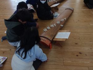 HOME > 学校生活 > 学校のようす > 琴の特別授業 琴の特別授業 入力日2026年2月3日 閲覧数27 4年生の音楽の学習で、琴の演奏を聞いたり、演奏したりしました。初めに、琴とピアノによる「春の海」の演奏を聞き、琴の音色の美しさや先生の演奏の技術に魅了されている様子でした。体を動かして聞いている子もいました。その後は、先生に教えていただきながら、一人ずつ「さくらさくら」の演奏に挑戦しました。最初の方は音を出すのが難しそうでしたが、慣れてくるときちんとメロディーになっていてうれしそうでした。日本の音楽に興味をもつきっかけになったと思います。 一覧へ戻る 次へ