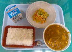 | 野菜(やさい)は1回(かい)の食事(しょくじ)で100g以上(いじょう)食(た)べると健康(けんこう)によいといわれています。100gというのは生(なま)の野菜(やさい)だとみんなの両手(りょうて)山盛(やまも)り1杯(はい)分(ぶん)、火(ひ)を通(とお)した野菜(やさい)だと片手(かたて)山盛(やまも)り1杯(ぱい)分(ぶん)です。両手(りょうて)山盛(やまも)りの野菜(やさい)は多(おお)いと思(おも)う人(ひと)もいるかもしれませんが、野菜(やさい)は火(ひ)を通(とお)すと量(りょう)が少(すく)なく見(み)えるので、炒(いた)めたりゆでたりして、かさをへらしてたくさんの野菜(やさい)を食(た)べましょう。今日(きょう)の給食(きゅうしょく)も100g以上(いじょう)の野菜(やさい)が食(た)べられるように作(つく)ってあります。残(のこ)さずしっかり食(た)べましょう。 |