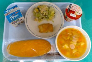 11月25日(火)ミルクパン 牛乳 鶏の照り焼き ツナサラダ 野菜スープ ヤクルト
