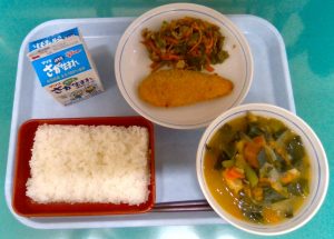 佐賀市(さがし)の小学校(しょうがっこう)では、できるだけ佐賀(さが)でとれる野菜(やさい)を給食(きゅうしょく)に使(つか)っています。2学期(がっき)にでてくる佐賀(さが)の野菜(やさい)は「ピーマン・里芋(さといも)・ほうれん草(そう)・にら・白菜(はくさい)・大根(だいこん)」です。これらの野菜(やさい)を使(つか)うときは、八百屋(やおや)さんが佐賀県産(さがけんさん)の野菜(やさい)をもってきてくださいます。地元(じもと)の農家(のうか)の方々(かたがた)が一生懸命(いっしょうけんめい)作(つく)った野菜(やさい)を残(のこ)さず食(た)べましょう。 |