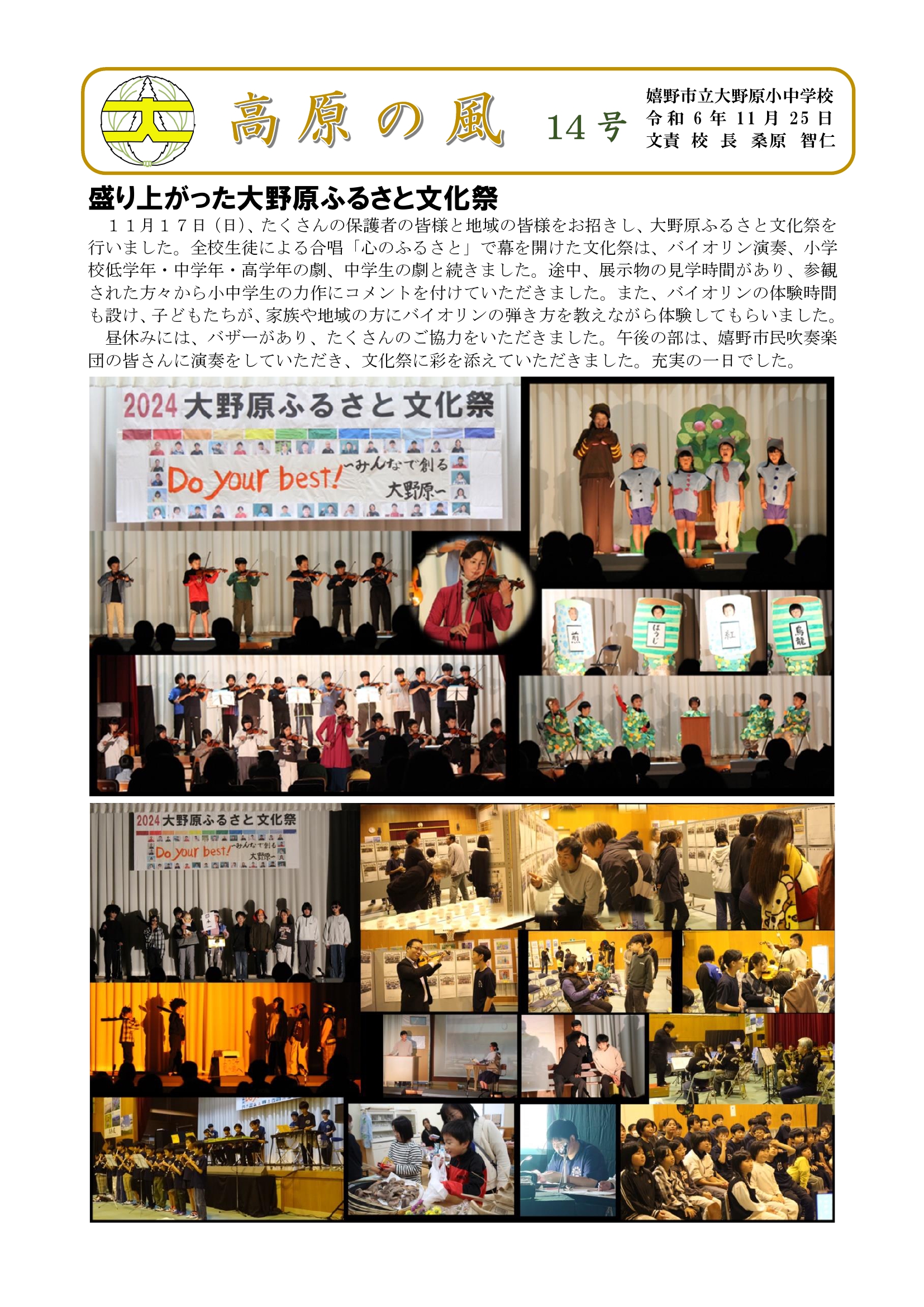 HOME > おたより > 学校だより「高原の風」 > 高原の風 2024 第14号 高原の風 2024 第14号 入力日2024年11月25日 内容 先日、大野原ふるさと文化祭を大盛況のうちに終えることができました。御参観いただいた多くの皆様方、本当にありがとうございました。 さて、学校便り「高原の風」第14号です。 ・2024大野原ふるさと文化祭について ・岩屋川内ダムの壁画 ・餅つき会のお知らせ 大野原にも冬の足音が聞こえ始め、高原の風も冷たくなってきました。後学期前半も残り1月となりましたが、子どもたちがさらに成長していけるよう応援お願いします。 12月1日は餅つき会を開催予定です。 閲覧数209 ファイル ファイル1ダウンロード ファイル2ダウンロード 前へ 次へ