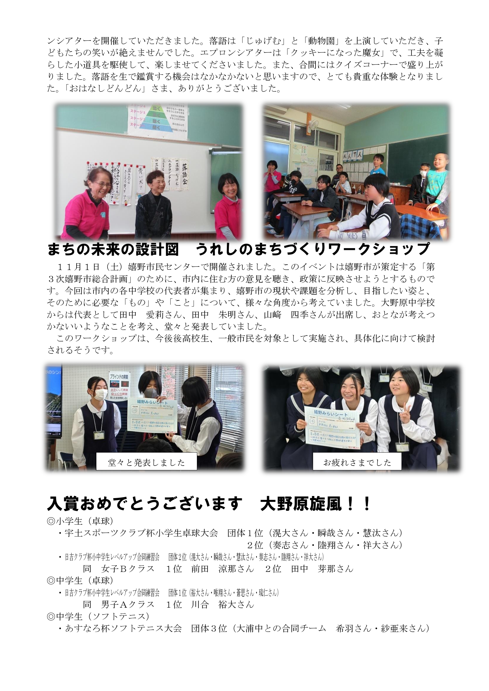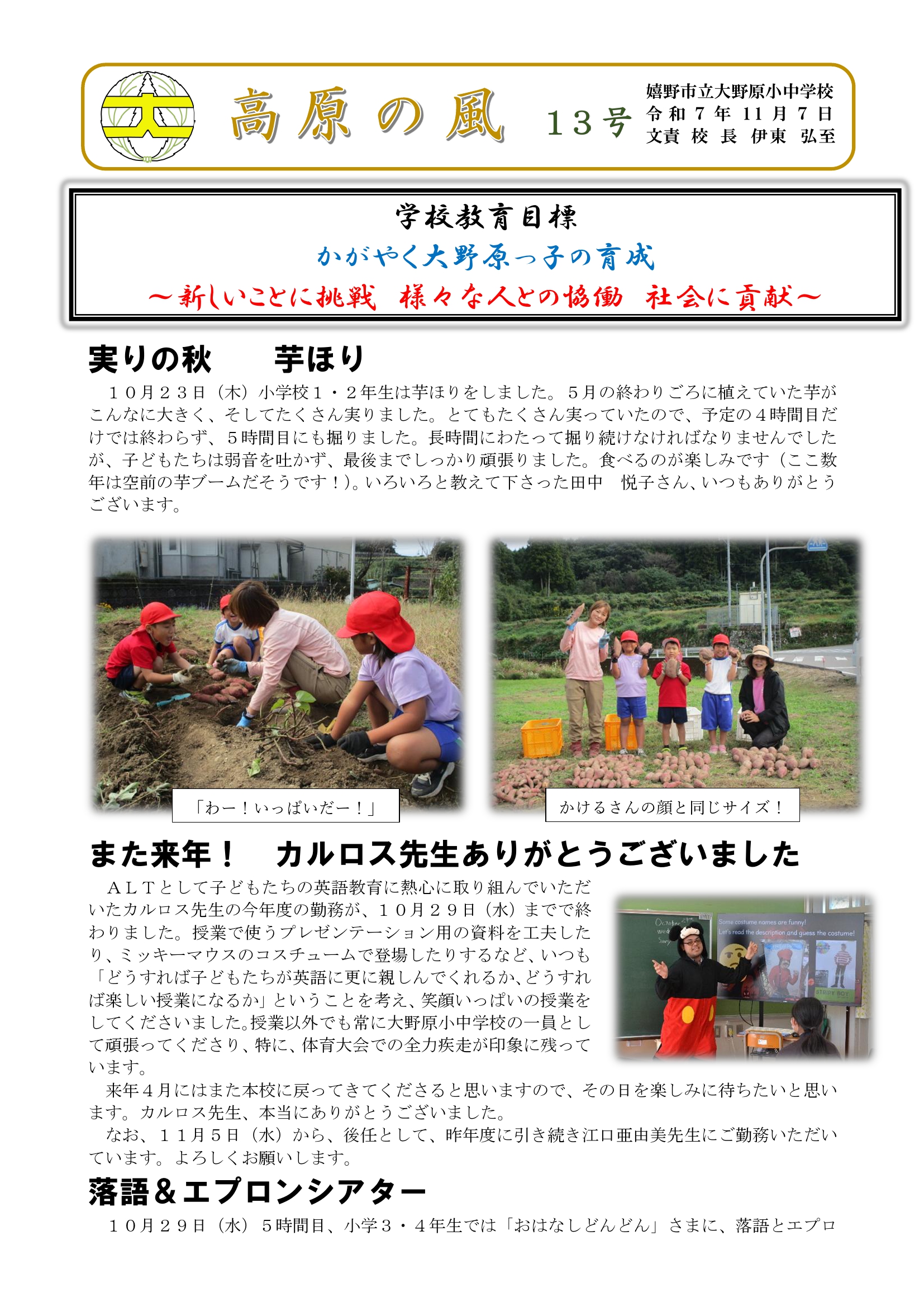 HOME > おたより > 学校だより「高原の風」 > 高原の風 2025 第13号 高原の風 2025 第13号 入力日2025年11月19日 内容今回の学校便り「高原の風 第13号」は ・実りの秋 芋ほり ・また来年! カルロス先生ありがとうございました ・落語&エプロンシアター ・まちの未来設計図 うれしのまちづくりワークショップ ・入賞おめでとうございます 大野原旋風!! です。大野原にも冬の足音が聞こえ始め、高原の風も冷たくなってきました。 後学期前半も残り1カ月半ほどとなりましたが、子どもたちがさらに成長していけるよう応援お願いします。 閲覧数78 ファイル ファイル1ダウンロード ファイル2ダウンロード 前へ 次へ