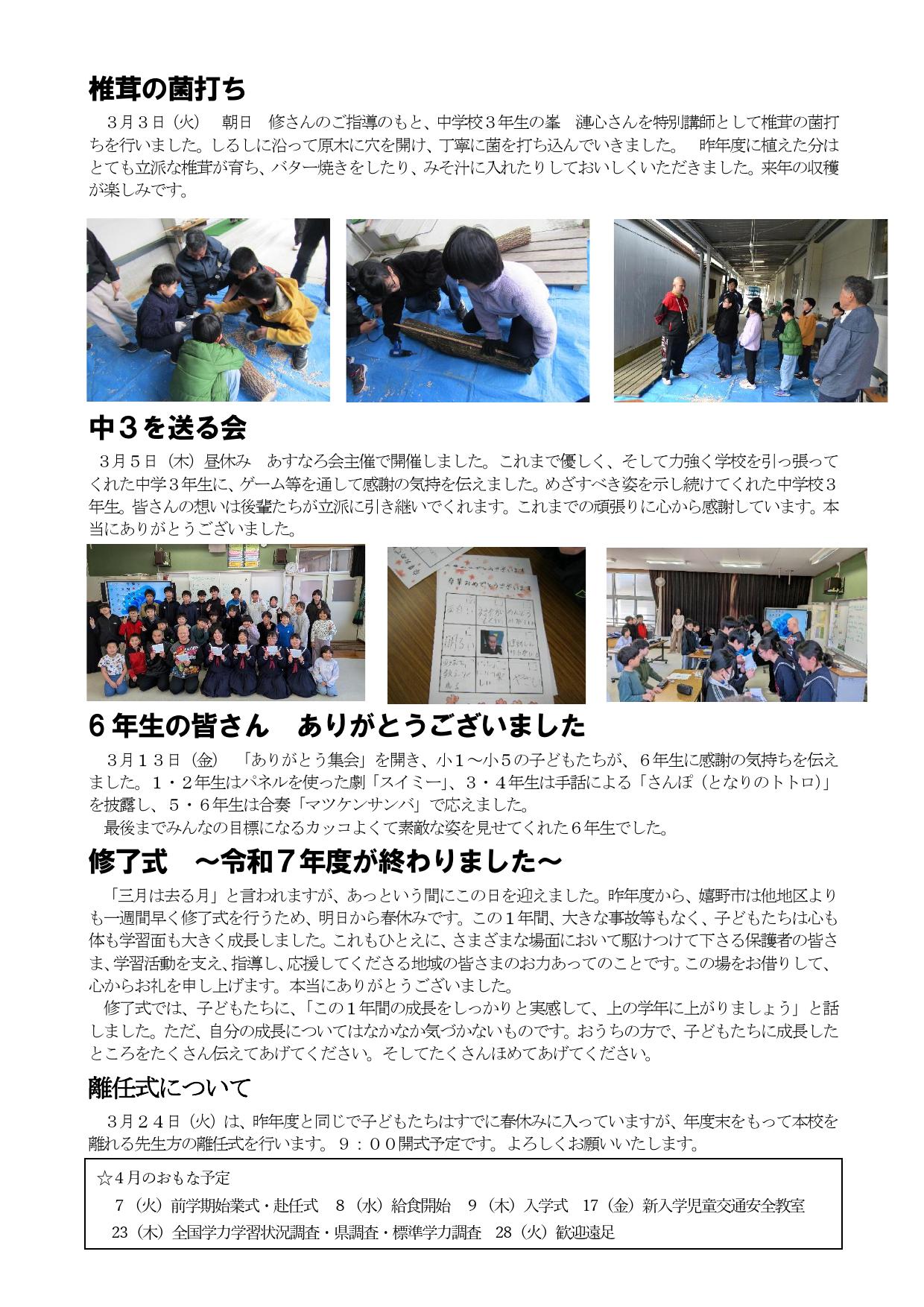 HOME > おたより > 学校だより「高原の風」 > 高原の風 2025 第21号 高原の風 2025 第21号 入力日2026年3月17日 内容 本日、令和7年度の修了式を迎えることができました。 様々な行事を通して多くのことを学び、たくましく成長した 子どもたちです。 本校の教育活動に御協力いただきました皆様、本当にありがとう ございました。 さて、今回の学校だより「高原の風」は・・・ ・限りない未来への旅立ち 卒業証書授与式 ・椎茸の菌打ち ・中3を送る会 ・6年生の皆さん ありがとうございました ・修了式 ~令和7年度が終わりました~ 令和8年度もよろしくお願いします。 閲覧数17 ファイル ファイル1ダウンロード ファイル2ダウンロード 前へ