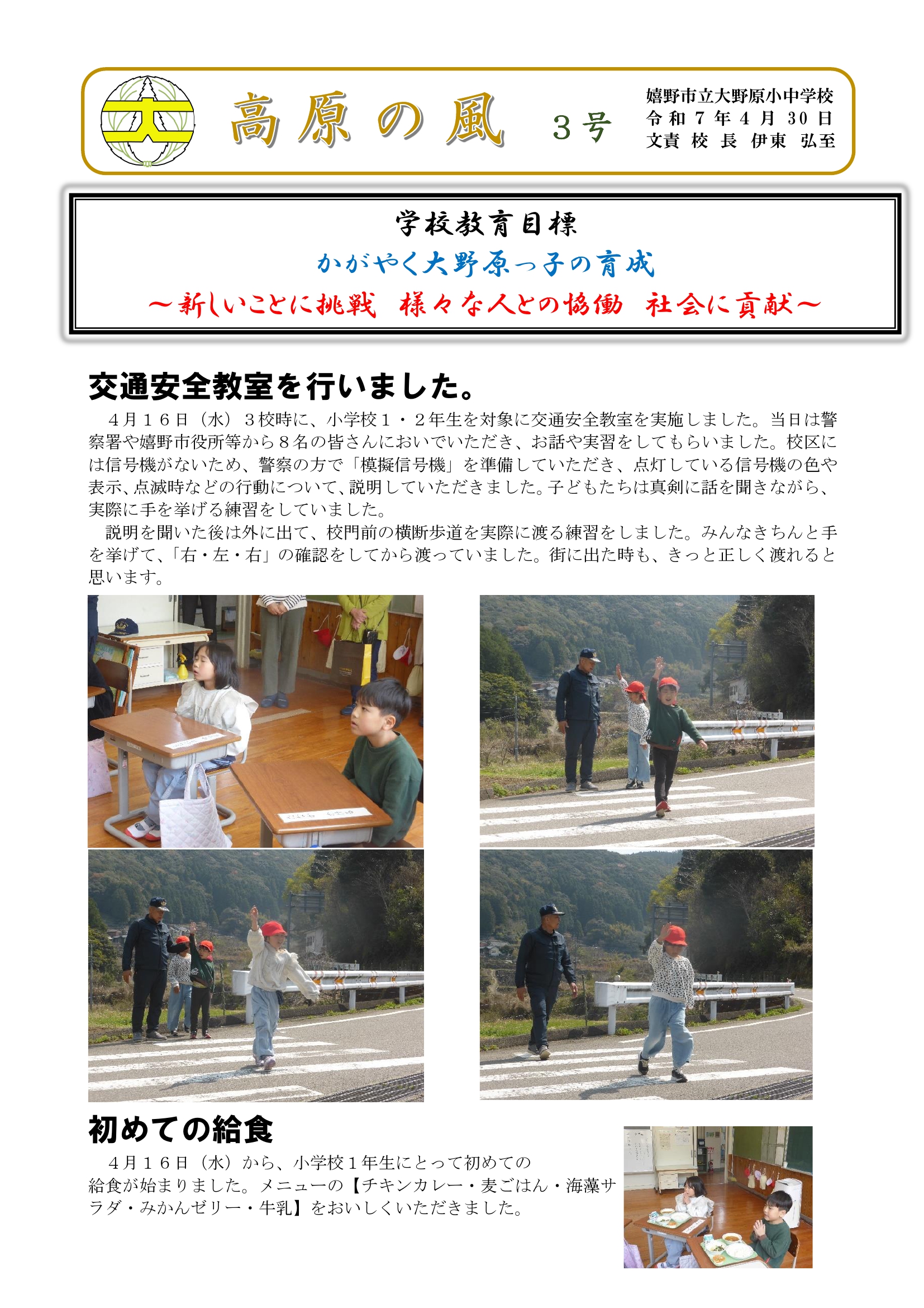 HOME > おたより > 学校だより「高原の風」 > 高原の風 2025 第3号 高原の風 2025 第3号 入力日2025年4月30日 内容 早いもので4月も本日で終わり、明日からは5月です。小学校1年生もすっかり学校に慣れて、教室から元気の良い声が響き渡っています。 さて、学校便り「高原の風 第3号」です。 ・小学校低学年のための交通安全教室 ・初めての給食 ・卓球部 九州・全国大会へ! ・歓迎集会の様子 ・職員紹介 新緑に包まれた大野原。お茶の季節がやって来ました。毎年恒例のお茶摘みが5月に予定されています。楽しみいっぱいの5月です。 閲覧数261 ファイル ファイル1ダウンロード ファイル2ダウンロード 前へ 次へ