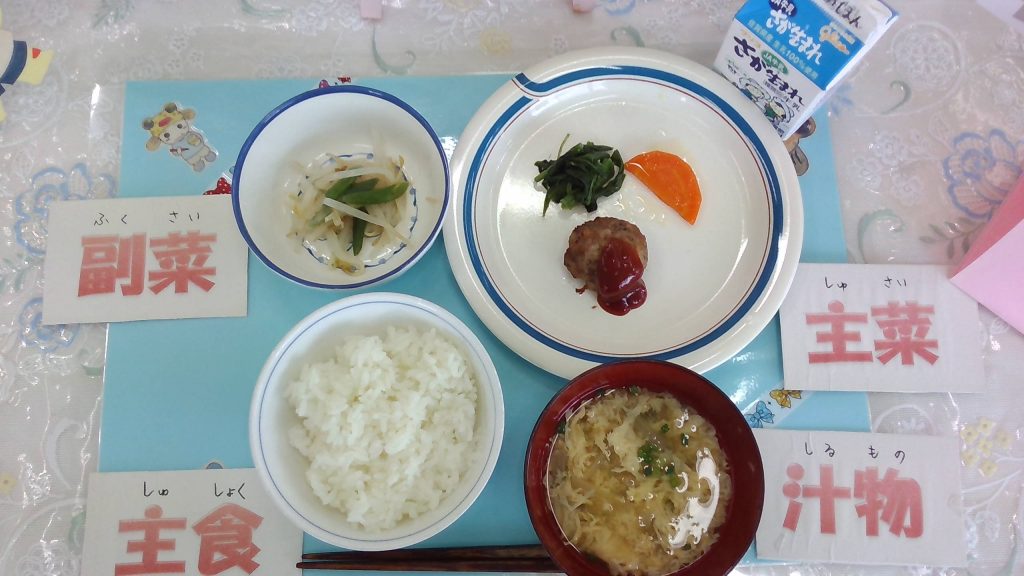 9月5日(火) ごはん 牛乳 ハンバーグ ソテー 人参のグラッセ もやしのサラダ かきたま汁