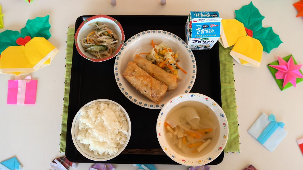 ごはん 手作り春巻き 温野菜 中華和え ワンタンスープ 牛乳