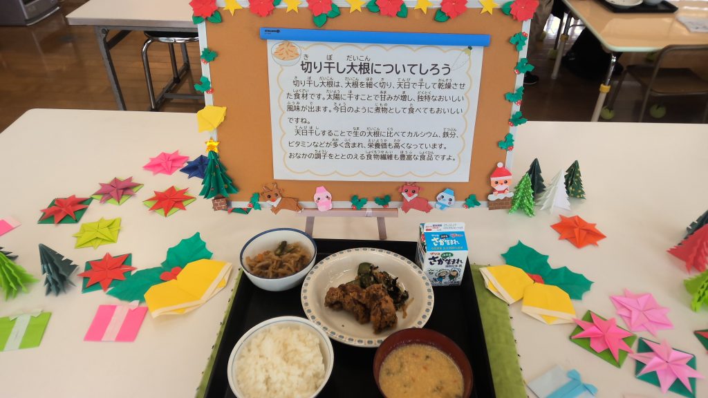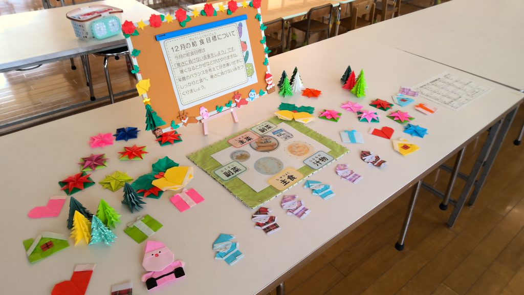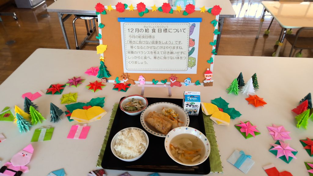 12月の給食目標は「寒さに負けない食事をしよう」です。寒くなる季節には風邪などがはやります。食事の前には石鹸を使ってしっかりと手洗いをして、栄養バランスの良い食事をとりましょう。主食・主菜・副菜・汁物がそろうと、自然と栄養のバランスもよくなりますよ♪また、献立表には、赤・黄・緑のグループの食品を載せています。これは、食べ物をその働きによって3つのグループに分けたものです。赤は体をつくるもとになる食べ物、黄はエネルギーの素になる食べ物、緑は体の調子を整える食べ物です。給食には色々な食品が入っていますよ。ぜひ、献立表を見てみてくださいね!