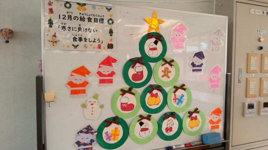 今日から12月ですね♪調理員さんによる手作りの食堂の飾りもクリスマス一色になりました🎄クリスマスが待ち遠しくワクワクする気持ちになる食堂の飾りつけです♪壁にはクリスマスのリースもたくさん飾ってありますよ✨