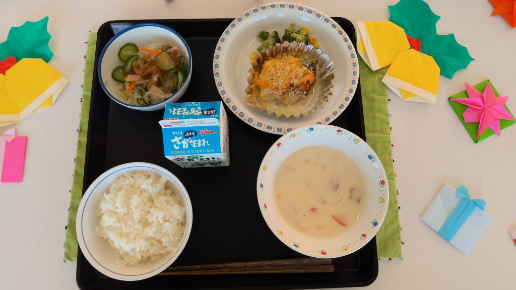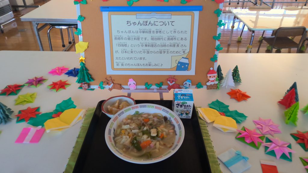 今日は、海鮮ちゃんぽんです。えびやいかが入って具だくさんですよ。ちゃんぽんは、長崎市発祥の中華料理です。寒さが厳しくなってきたため、温かい麵料理は体が温まりますね♪洋風大学芋も、佐賀県立ろう学校の人気メニューのひとつですよ!外はカリッと中はほくほくとしたさつまいもに、スキムミルクを使って手作りされた甘いたれがかかっています。練乳のように甘くておいしいですよ♪