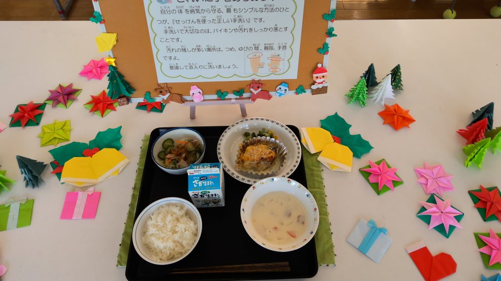 12月になり、寒さも厳しくなってきました。食事の前の手洗いをしっかりしましょう、つめ、指の間、親指、手首は特に汚れの残しが多い場所です。意識して念入りに洗いましょう。早寝・早起き・朝ごはんの規則正しい生活と、栄養バランスのとれた食事も心がけ、風邪などをひかずに元気に過ごしていきたいですね。