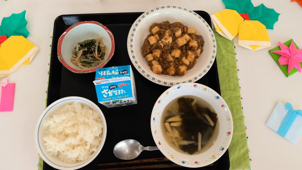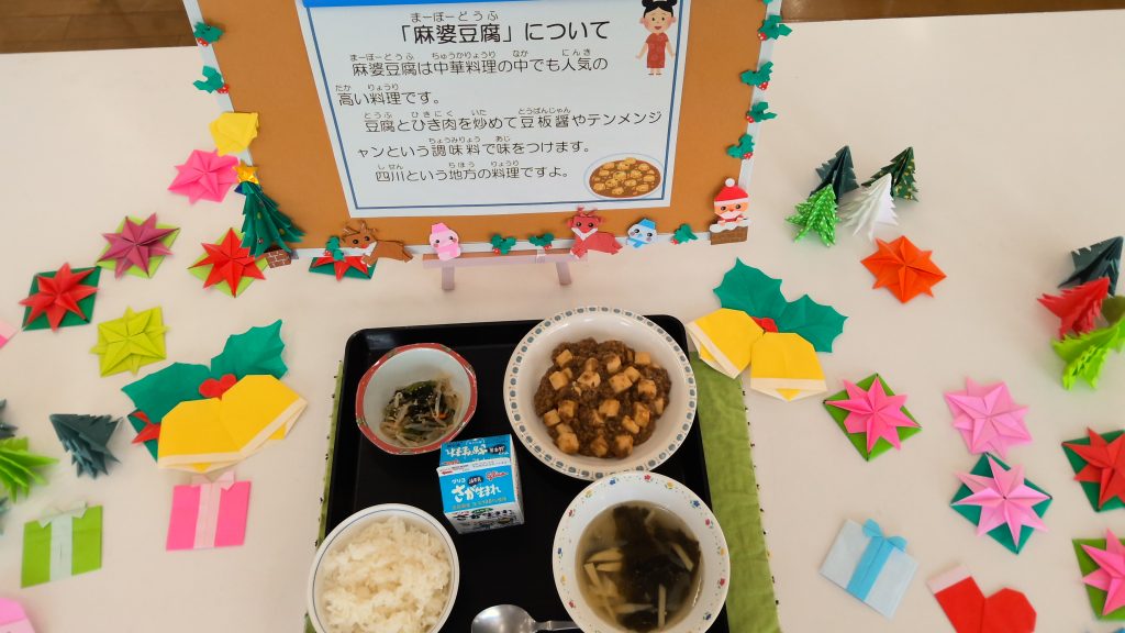 本日はマーボー豆腐の給食です。給食で使用している豆腐は、佐賀県産の大豆を使用し、成長期に特に大切な鉄分・カルシウム・食物繊維が強化された給食専用の豆腐です。荷崩れしにくく、本日のマーボー豆腐の献立にもぴったりですよ。寒い季節には、ピリッとした唐辛子や、にんにく、しょうがなどが効いたマーボー豆腐は体を温めてくれますね。