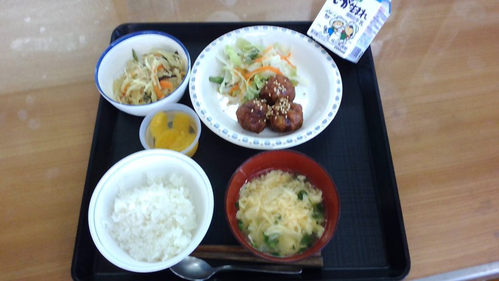 11月25日(金) 麦ごはん 牛乳 トンテキor鶏つくねの甘酢煮 茹で野菜 ビーフン炒め かきたま汁 みかんゼリー