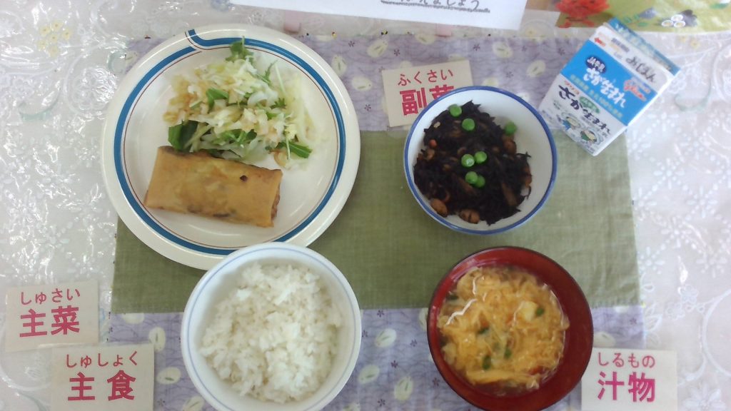 2月10日(金) 麦ごはん 牛乳 春巻き 茹で野菜 大豆の磯煮 卵とトマトのスープ