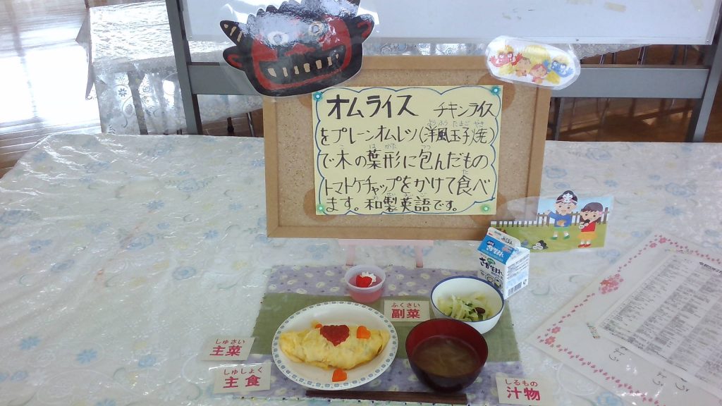 2月14日(火) オムライス 牛乳 野菜と豆のサラダ オニオンスープ いちごゼリークリーム添え
