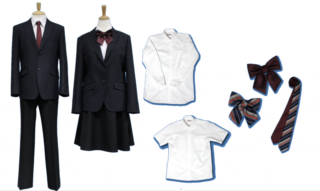 ①黒の詰襟型標準学生服は、上位の右前裾及びズボンの左前ベルト下にそれぞれ校章を入れる。また、夏服、合服は、本校制定のシャツを着用する。ソックスは白のスクールソックスとする。