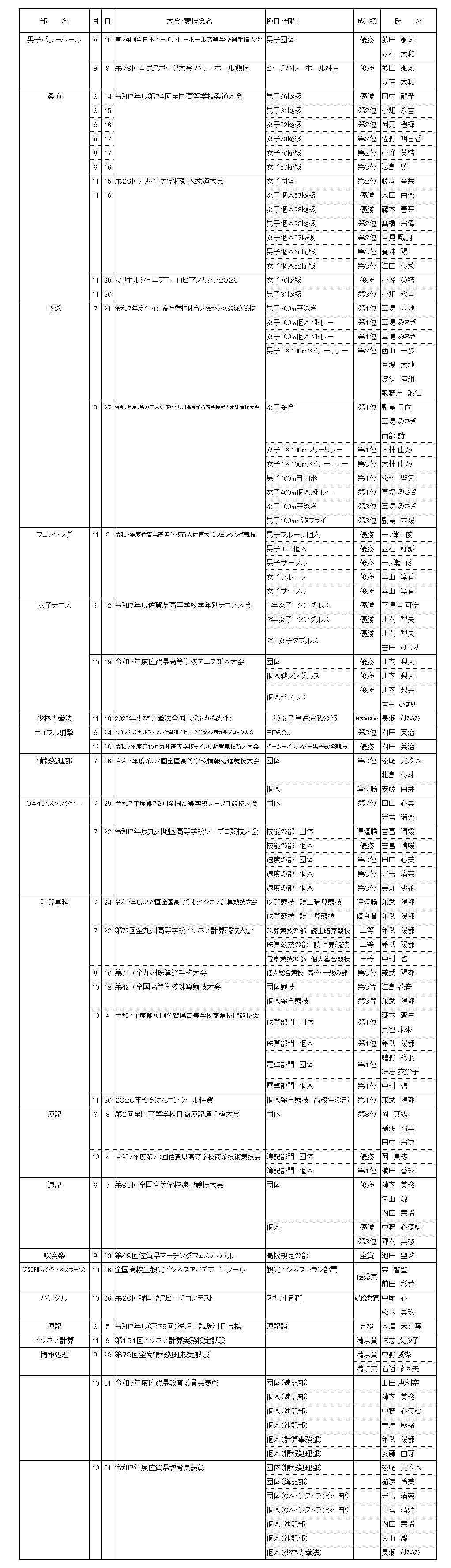 HOME > 学校生活 > SASHO★トピックス > R7二学期終業式・第4回表彰式 R7二学期終業式・第4回表彰式 入力日2025年12月24日 閲覧数61 令和7年12月24日(水)に二学期終業式を行いました。 緒方康二校長先生は、二学期の振り返りをされるとともに、学業や部活動、学校行事での努力を一人ひとりが見せてくれたことを称賛し、これからも挑戦を続けてほしいと激励の言葉を送りました。 また、第4回表彰式を行いました。今回は高校総体後の全国大会や九州大会での活躍を表彰しました。 【表彰の部】県1位、全国ベスト8・九州3位まで 前へ 一覧へ戻る 次へ
