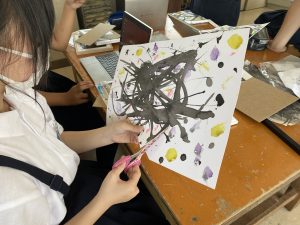 HOME > 子どもたちの活動の様子 > 日々の学校の様子 > 墨で表す(6年生) 墨で表す(6年生) 入力日2022年7月1日 閲覧数672 「墨で表す」という学習に取り組みました。自分で製作した「おもしろ筆」や刷毛をつかって、墨の濃淡、かすれなどを生かしながら製作しました。アクリル絵の具をスポンジにつけ、アクセントにスタンプをいれている子どももいます。できた作品の気に入ったところをフレームに合う大きさにトリミングし完成です!二つとない素敵な作品ができました!1学期中には、持ち帰らせます。ぜひ、ご自宅に飾ってください! 前へ 一覧へ戻る 次へ