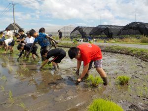 HOME > 子どもたちの活動の様子 > 日々の学校の様子 > 田植え(5年生) 田植え(5年生) 入力日2023年6月29日 閲覧数820 6月27日(火)天気に恵まれ、5年生が田植えを行いました。 苗は自分たちで育てました。その見事な成長ぶりに、地域の方からお褒めの言葉をいただきました。 初めて経験する子供たちが多く、水田に足を入れると「ぬるぬる!」「気持ちいい!」などの元気な声が聞こえてきました。開始直後は、恐る恐るという感じでしたが、徐々に楽しみながら活動することができました。 子供達は、おいしいお米ができることを願いながら田植えをしたことと思います。 前へ 一覧へ戻る 次へ