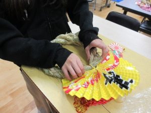 最後は、できあがったしめ縄に飾り付けを行います。海老やのぼり旗などを、それぞれが思い思いに飾り付けを行いました。