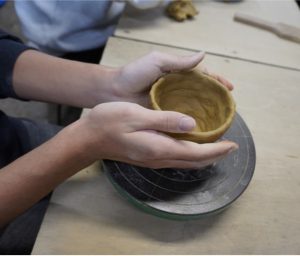 初めに、湯飲みやコーヒーカップの底になる部分、土台をつくりました。一握りの粘土を伸ばし、円形に整えます。その後、紐状に粘土を伸ばし、土台の上に積み重ねていきます。5段ほどに積み上げてから、飲み口にあたる部分を整えます。その後、自分の好きな色を選び、つくり上げた湯飲みやコーヒーカップに名前を彫ります。1時間程の体験でしたが、時間がたつのを忘れるくらい、集中して取り組みました。