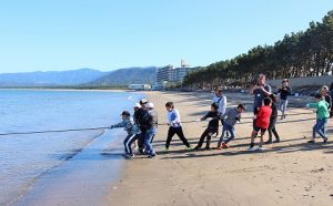 海に学ぶ学習をしてきた5年生。今日は、学年PTA親子活動とタイアップして、東の浜で地引網を楽しむことになりました。
