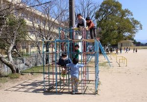 春の陽気に誘われて、たくさんの子供たちが運動場や中庭で遊びました。