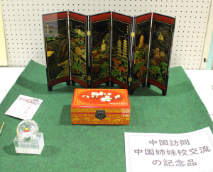 文化発表会では、今年度、姉妹校である中国の山西大学附属中学校から交流再開を記念して贈られた品物を展示しました。中央の漆器(黒い屏風と箱)は、学校への記念品。まわりの書道や絵画は、附属中の生徒の作品です。