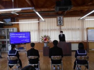 また、式後には講演会として森﨑様より講話をしていただきました。森﨑様は、本校の卒業生で現在は製薬会社で「MR」をされています。テーマは「みえないところから医療に貢献~MRというお仕事~」でした。話の中では、MRの資質として①人の話をよく聞く②わかりやすく説明する③勉強を続ける④相手に興味をもつ⑤約束を守る などが大切である。大変ではあるが、人の命を助ける素晴らしい職業である。と述べられていました。生徒の皆さんも、周りに感謝をし、たくさん挑戦してほしいとのことでした。今後は大人としての自覚をもち、将来の目標に向けて「志」を立てて生活してくれることを期待します。