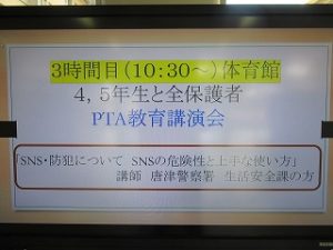 また、教育講演会では、講師として、唐津警察署の大園様、株式会社ぴーぷるの木須様にお越しいただき、4~5年生児童と、全学年保護者対象の「SNSの安全な利用」についての講話をしていただきました。SNSは便利です。しかし、そこには大きな危険が潜んでいます。成和小でも、本年度、オンラインゲームでのアイテムのやりとりのかかわるトラブルや、チャット機能での相手を傷つける言葉の投稿、また、許可なく学校にスマホを隠し持ってきて、youtubeを見たりゲームをしたりして指導をした事例があっています。私たちは、SNSやインターネットの正しく安全な使い方を知る必要があります。今日の講話を参考に、お子様や保護者様ご自身が、トラブルに巻き込まれたり、ゲームやネットに依存したりしてしまうことがないよう、ご家庭でのルール作りに活かしていただけたら幸いです。