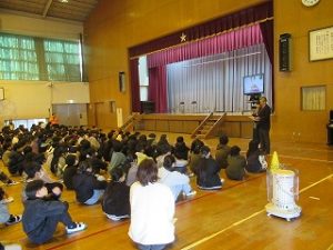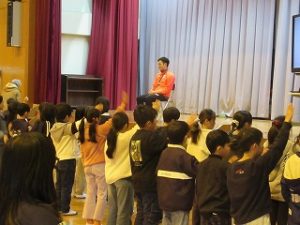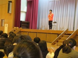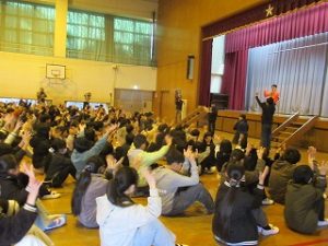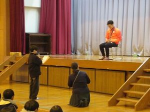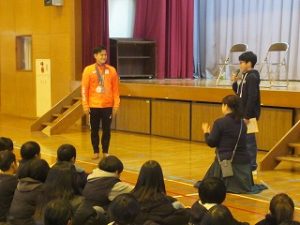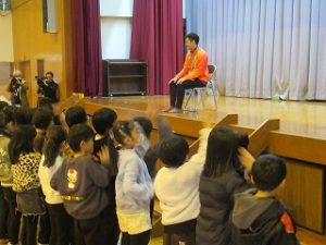 成和小学校でも、金持選手のデフリンピック出場にあたり、全校児童で応援メッセージを国旗に書いて贈りました。また、3年生は、総合の学習で取り組んだ「手話」を使って、金持選手に、手話の応援メッセージの動画を贈りました。成和小の児童の気持ちが、金持選手の力につながったのであれば、とてもうれしく思います。そして、4年生は、去年、3年生の時に同じように総合で取り組んだ手話を生かして、手話の校歌を自分たちで考え、学習発表会で披露したり、全校のみんなに教えてくれたりしました。集会では、4年生の手話を取り入れた成和小の校歌を、金持選手に披露しました。