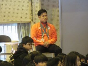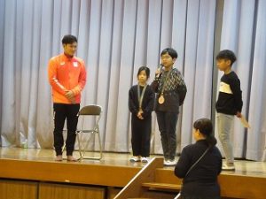 令和8年1月13日、東京2025デフリンピック銅メダリストの金持義和選手に来校いただき、「金持選手おめでとう集会」を行いました。