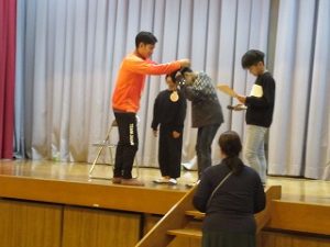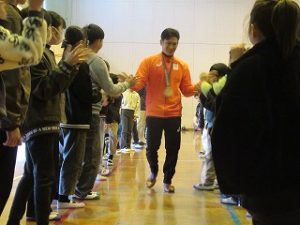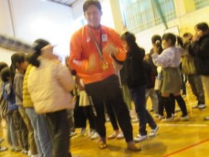金持選手は成和小学校の卒業生、子供たちのの大先輩です。小さいころから水泳に取り組み、これまで、たくさんの大会で素晴らしい成績を残されてきました。今年11月に東京で開催された、東京2025デフリンピックでも日本代表に選ばれ、4大会連続の出場となられました。そして、競泳男子50メートル背泳ぎでは、見事「銅メダル」を獲得。また、男子メドレーリレーでは、背泳ぎに続き、2個目の銅メダルを獲得されました。本当に、おめでとうございます。
