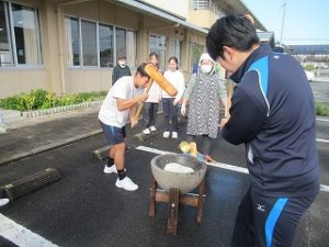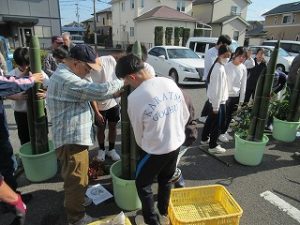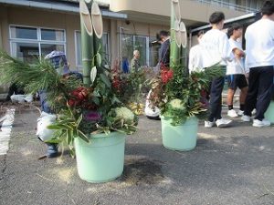成和地区の地域の皆様のご協力で、今年も門松を作っていただきました。児童玄関に飾ってあります。門松は、お正月に家の入口に立てられる、一対になった飾りで、長さの違う3本の竹に松の枝をたばね、梅の枝や季節の植物をあしらったものです。また、竹をななめに切った切り口が、人の笑った顔に見えることから、「笑う門には福来る」ともいわれます。松、竹、梅は、昔から縁起の良い植物だと言われています。是非、門松の、どこに松、竹、梅が飾られているのか、また、竹の切り口が笑った顔に見えるのかを確かめてみてください。