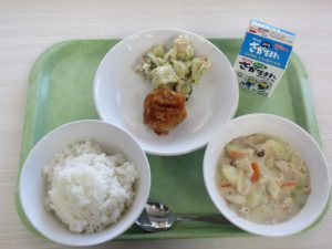 HOME > 学校生活 > 今日の給食 > 11月10日 11月10日 入力日2025年11月10日 閲覧数27 11月10日(月)献立 ・御飯 ・牛乳 ・鶏肉のおろしソースかけ ・さつま芋とアーモンドのレモマヨ和え ・3匹の熊のクリームスープ 3びきのくまの絵本に登場するスープを給食に 提供しました。 前へ 一覧へ戻る 次へ