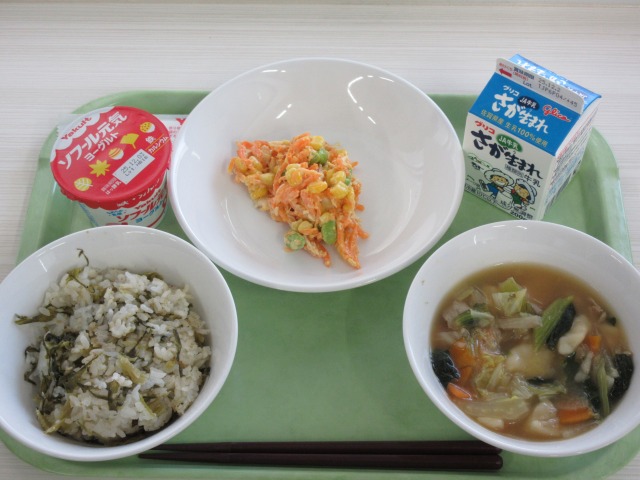 HOME > 学校生活 > 今日の給食 > 11月19日 11月19日 入力日2025年11月19日 閲覧数26 11月19日(水)献立 ・高菜チャーハン ・牛乳 ・人参と枝豆のサラダ ・だご汁 ・ヨーグルト ☆今日は日本の味めぐりの日で、熊本県のメニュー を紹介しました。 前へ 一覧へ戻る 次へ