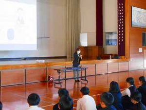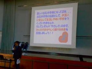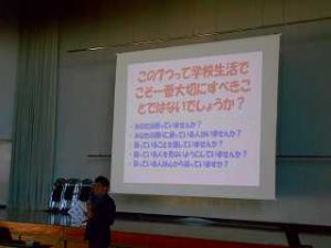 次に、人権・同和教育担当の川﨑先生から、佐賀県として、「さがすたいる」の取り組みについて紹介があり、「さがすたいる」を「しろいしすたいる」として、日々の生活に取り入れて取り組んでいけるような生徒になってほしいという話をしました。