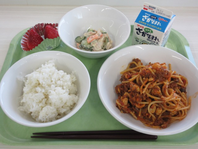 HOME > 学校生活 > 今日の給食 > 2月17日 2月17日 入力日2026年2月17日 閲覧数18 2月17日(火)献立 ・少なめ麦御飯 ・牛乳 ・テンペ入りスパゲティ ・蓮根とツナのサラダ ・いちご ☆今日は白石食の日です。 一覧へ戻る 次へ