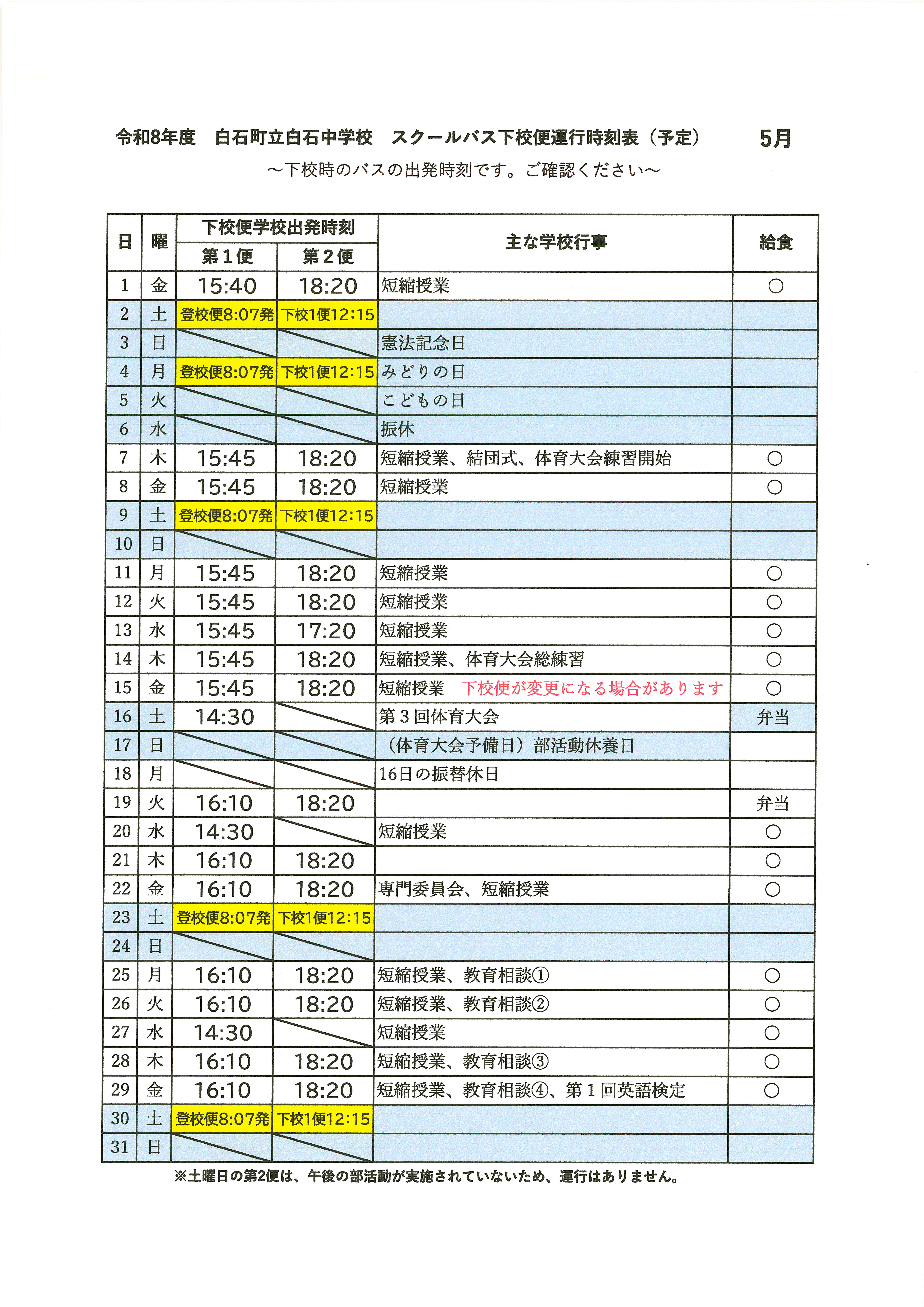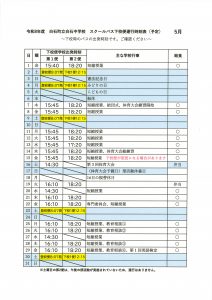 HOME > 各種お便り > スクールバス > スクールバス時刻表(5月) スクールバス時刻表(5月) 入力日2026年4月28日 内容5月のスクールバスの運行表です。 ご確認ください。 閲覧数10 前へ