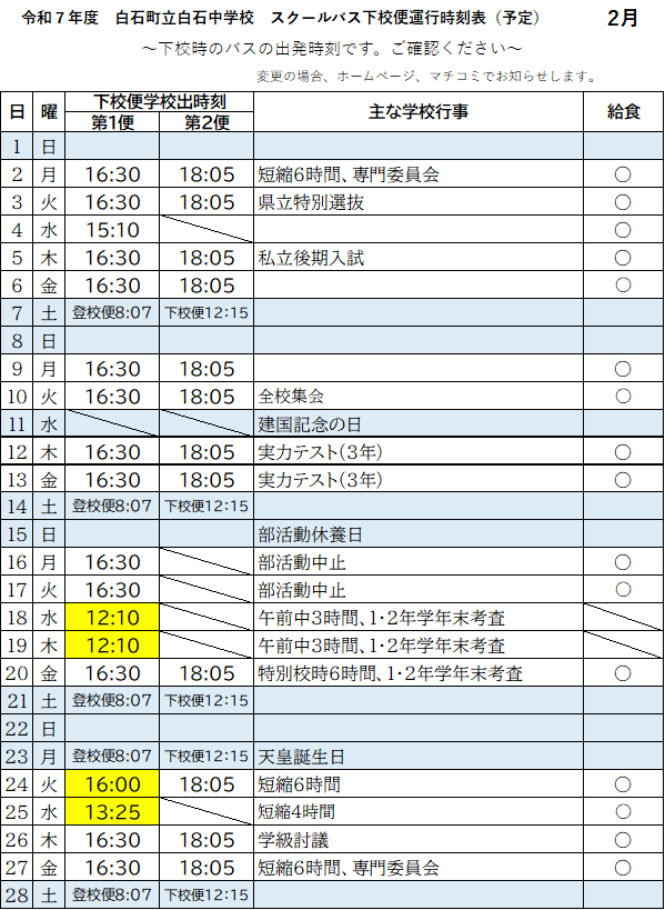 2月の運行予定