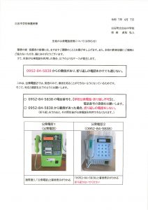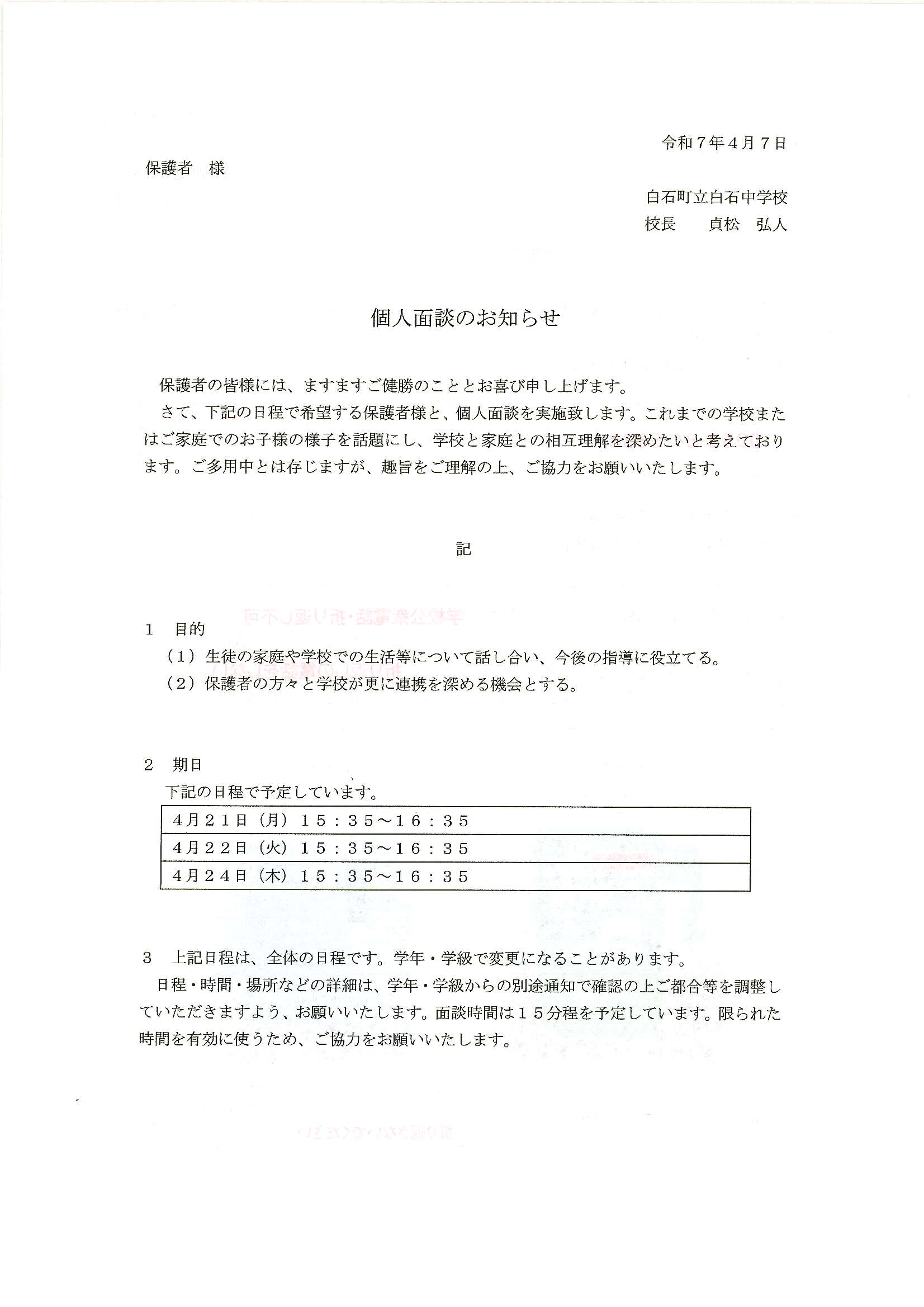HOME > 各種お便り > 学校からのお知らせ > 0407.学校よりのお知らせ・お願い 0407.学校よりのお知らせ・お願い 入力日2025年4月8日 内容 次のプリントを配布しています。確認をお願いします。 マチコミメール登録のお願い マチコミメール登録の方法 学校への電話連絡の対応について 個人面談のお知らせ 生徒の公衆電話使用について 広報活動における写真・映像・ 氏名の使用について 欠席・遅刻等の学校への連絡について 閲覧数528 前へ 次へ