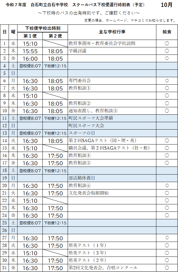 HOME > 各種お便り > スクールバス > 10月の運行予定 10月の運行予定 入力日2025年9月26日 内容10月の運行予定 変更の場合がありますので、毎週の時間割でご確認ください。 閲覧数99 前へ