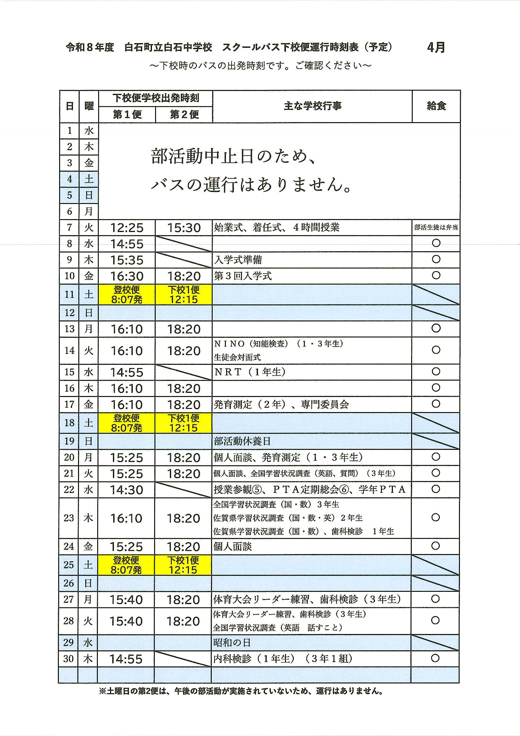 HOME > 各種お便り > スクールバス > スクールバス時刻表(4月) スクールバス時刻表(4月) 入力日2026年4月6日 内容4月のスクールバスの運行表です。 ご確認ください。 閲覧数298 前へ 次へ