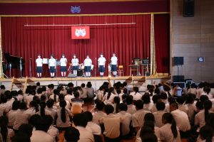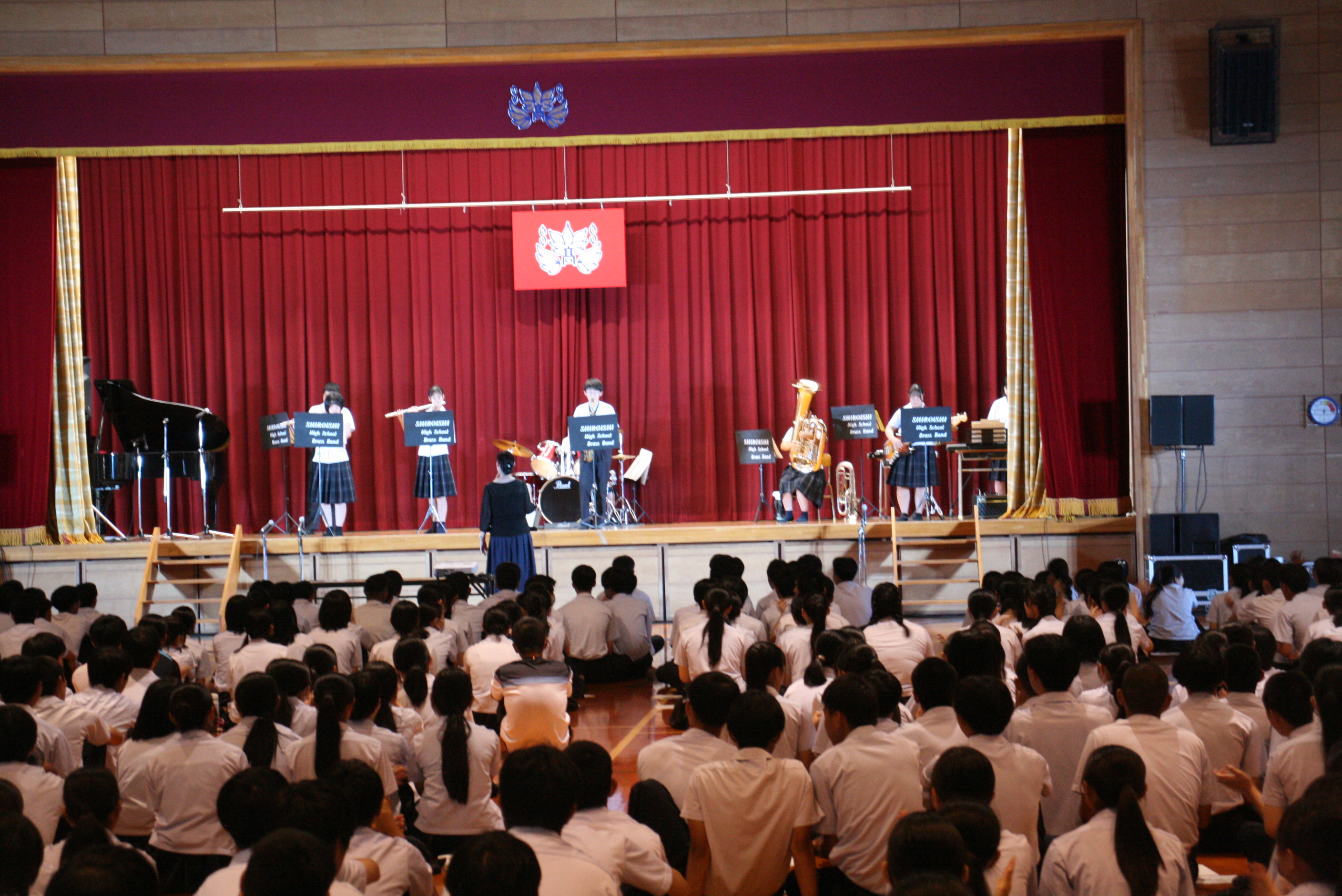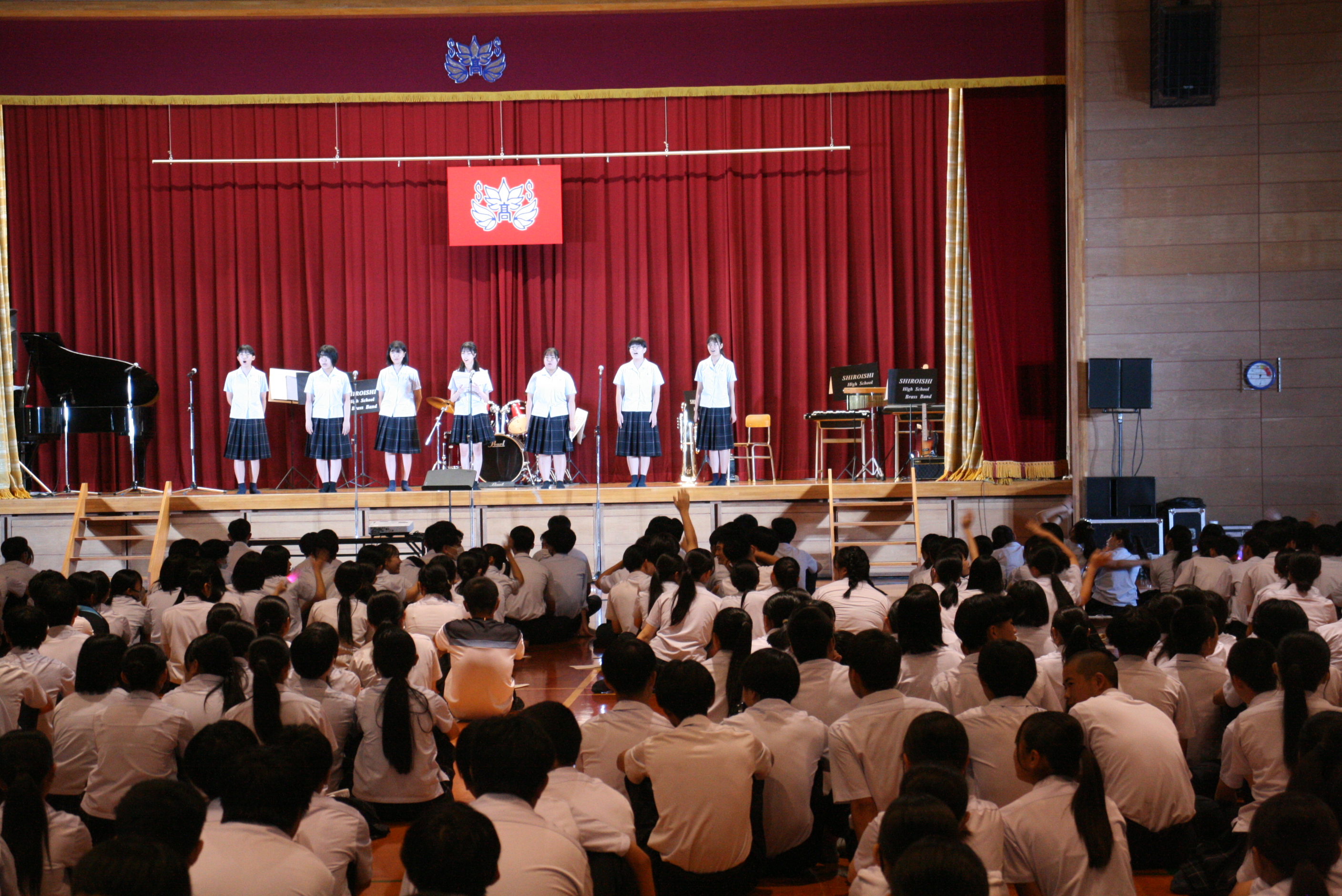 HOME > 吹奏楽・合唱部 吹奏楽・合唱部 月~金まで、吹奏楽と合唱の活動に取り組んでいます。 両キャンパス合同で、普通科キャンパス音楽室で活動しています。 主な活動としては、以下の通りです。 ・壮行式での演奏 ・全国高等学校総合文化祭 合唱部門 出場 ・九州合唱コンクール出場 ・文化祭 ・保育園訪問 ・成果発表会 少人数の活動ですので、今後は部員を獲得し、コンクールを目指すことが目標です。 文化祭の写真です♪