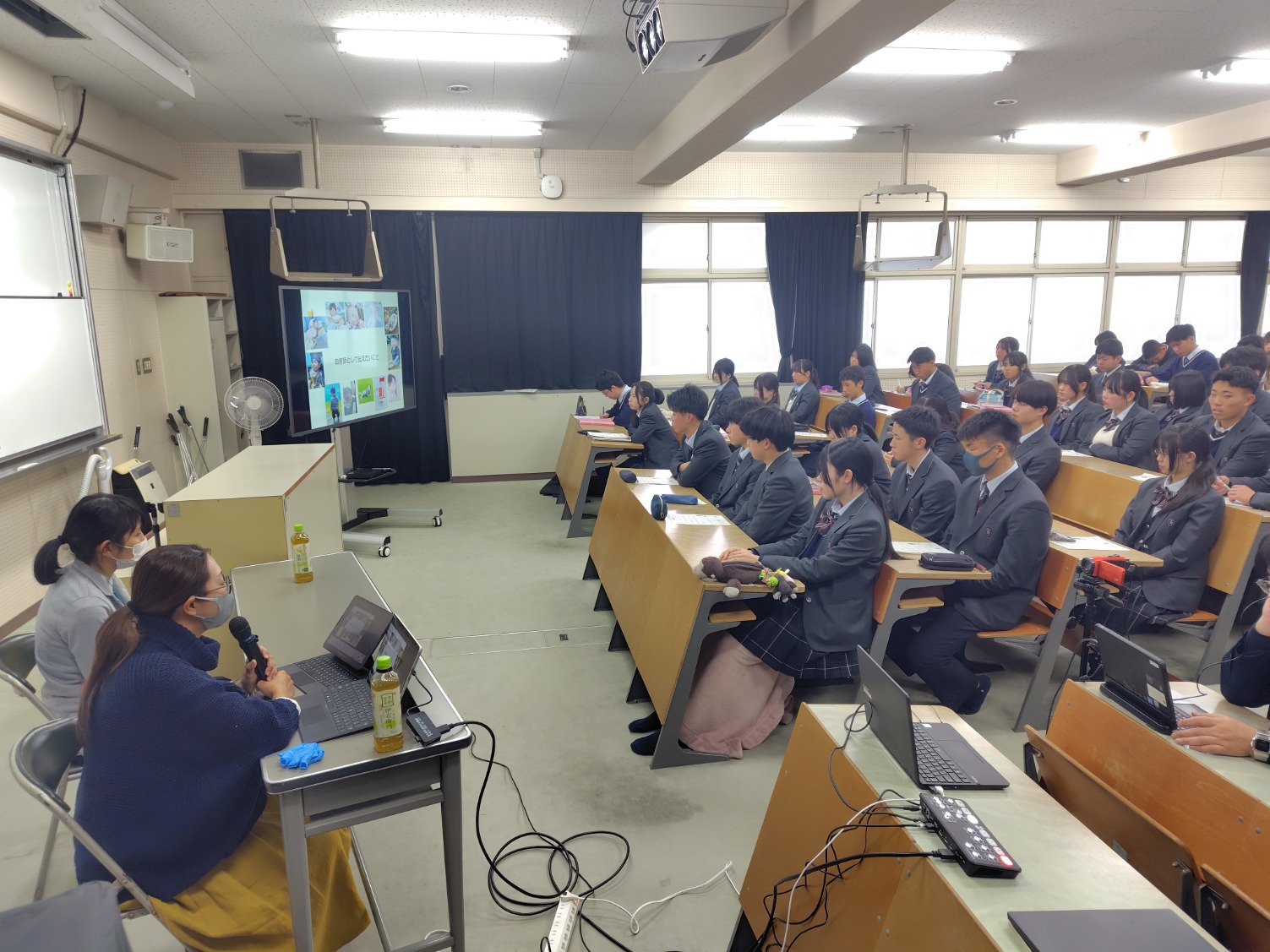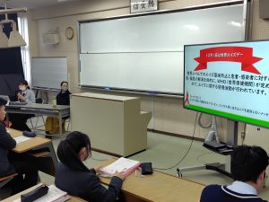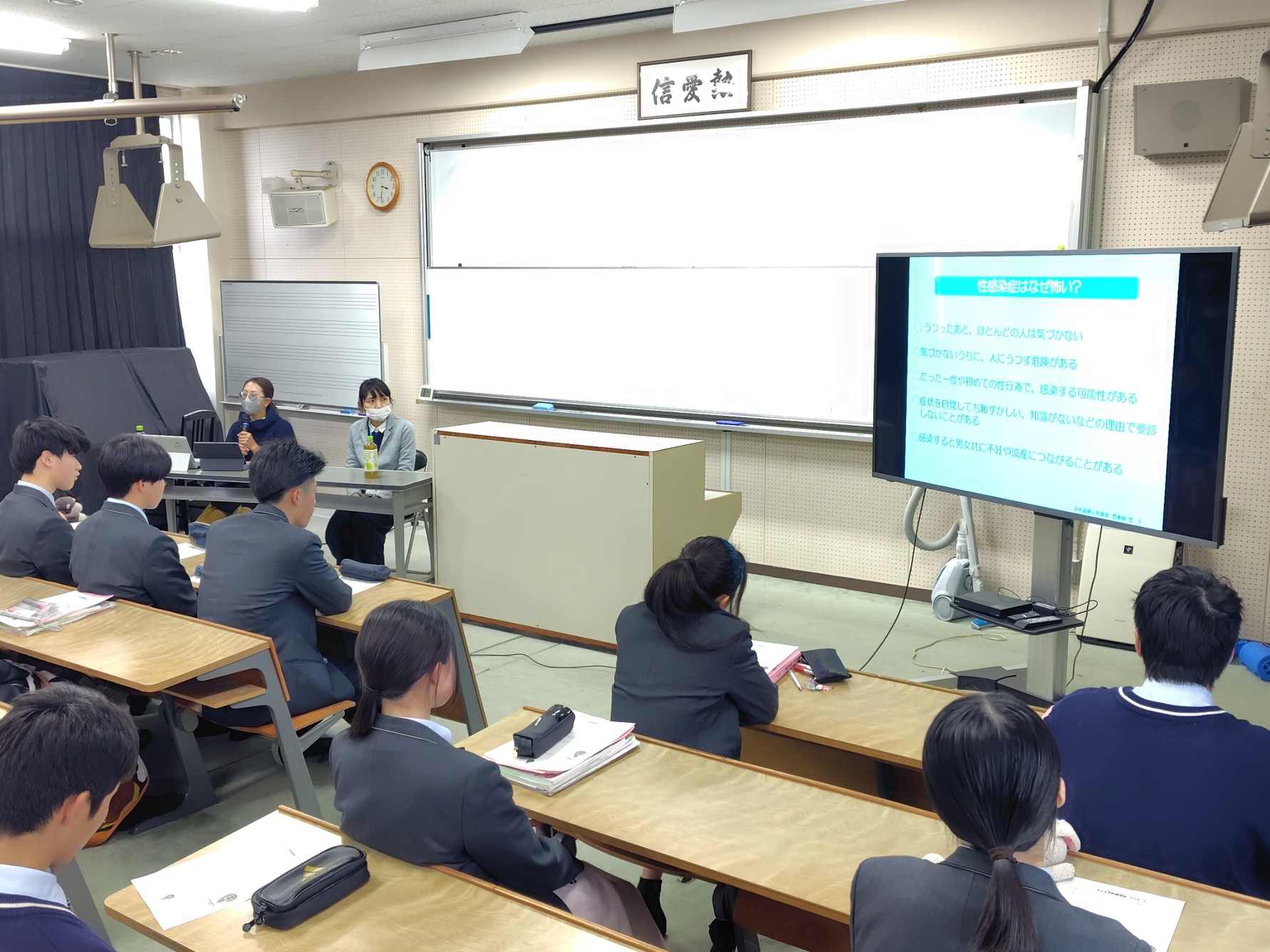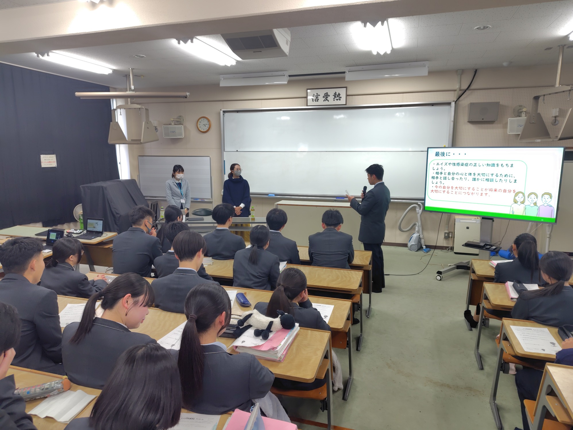 HOME > 両キャンパス行事・活動 > 2026.1.29 エイズ予防講演会 2026.1.29 エイズ予防講演会 入力日2026年2月9日 閲覧数46 1年生対象に、嬉野医療センター助産師 梶原智絵様と杵藤保健福祉事務所健康推進担当 中島雅子様を講師に招き、「エイズの正しい知識と性感染症の予防」~大切にしよう自分の「生」と「性」~の演題で講演頂きました。また、相談窓口についても説明していただき、感染症への意識が高まりました。 講演を真剣に聞く生徒たちの様子 「生」と「性」について説明される助産師の方 相談窓口の説明をされる健康推進担当者 講師の方々に謝辞を述べる生徒代表 一覧へ戻る 次へ