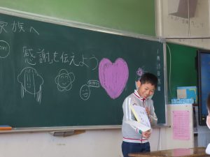 4年3組では、家族に感謝していることを発表しました。感謝していることを絵に表現したり、感謝状を書いたり準備をしていく中で、子どもたちは家族の方々にたくさん支えられていることを改めて気付き、家族についてたくさん考える時間となりました。