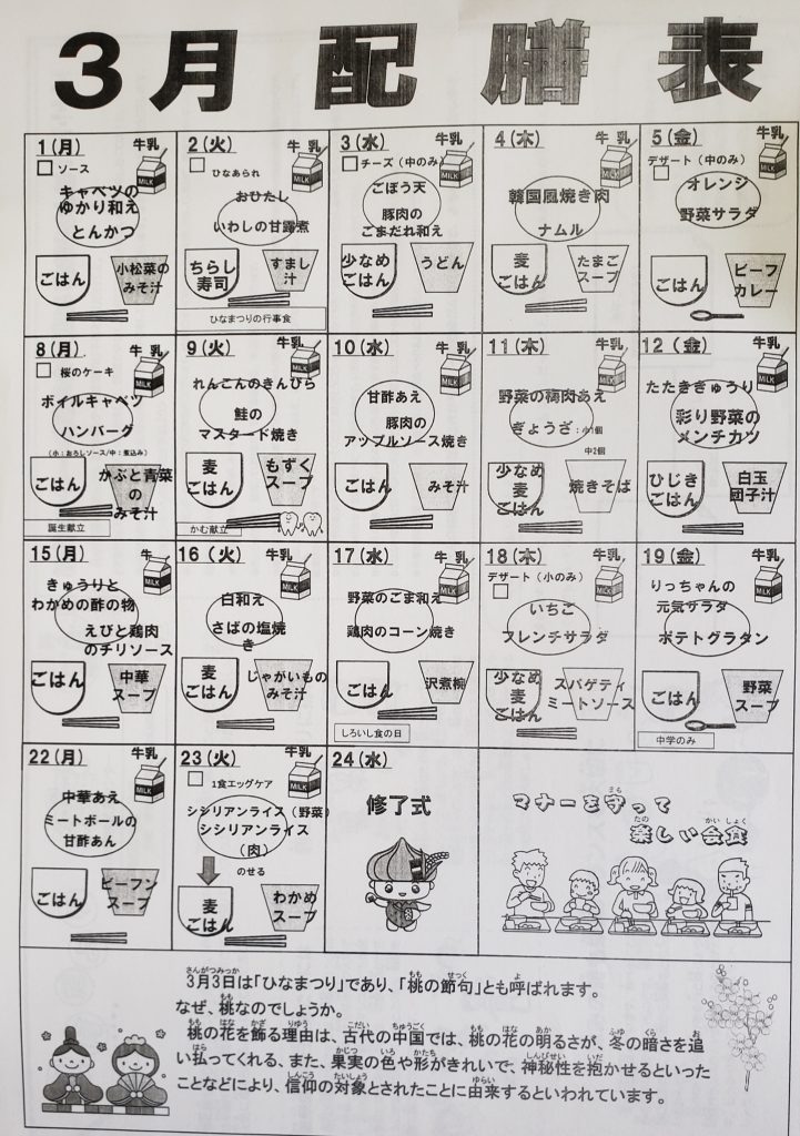HOME > > 3月の献立です。 3月の献立です。 入力日2021年3月2日 閲覧数271 今年度も最後の月になります。 6年生は、小学校での給食が最後になります。 毎日作って下さってありがとうございます。 前へ 一覧へ戻る 次へ
