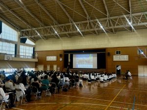その後に全校集会を行い、表彰と校長先生の話がありました。話の中では、学校内外での生徒の活躍の様子や、これからの学校生活についての話などがありました。