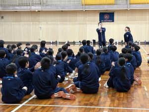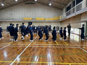 2日目はレクリエーションを行いました。体育大会で行う大縄跳びの練習など体育館で体を動かし、クラスで協力して活動しました。その後研教科担当の先生から学習の話があり、研修全体の振り返りや感想を記入しました。