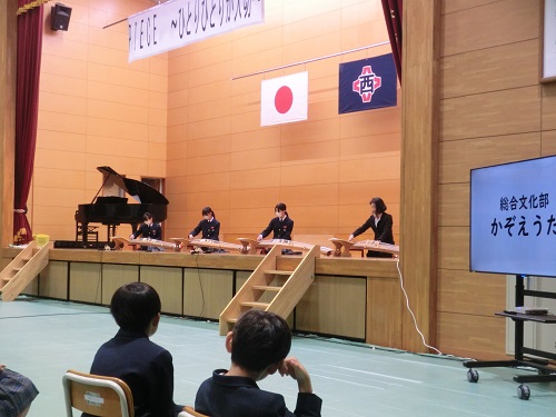 今年度は、4年ぶりに全校児童生徒が西体育館に集合して、文化発表会を行いました。発表会テーマ「PIECE ~ひとりひとりが大切~」のもと、各学年が日頃の学習の成果を生かし、工夫して合奏や演技を発表しました。また、5年から9年生は、心をひとつに美しいハーモニーを作り上げることをめざし練習を重ねた合唱を披露することができました。8・9年生は、平和学習の総まとめとして劇を作り上げ、演じることができました。同じ会場では、書写や絵画、総合的な学習のまとめなどの展示作品も見ていただくことができました。